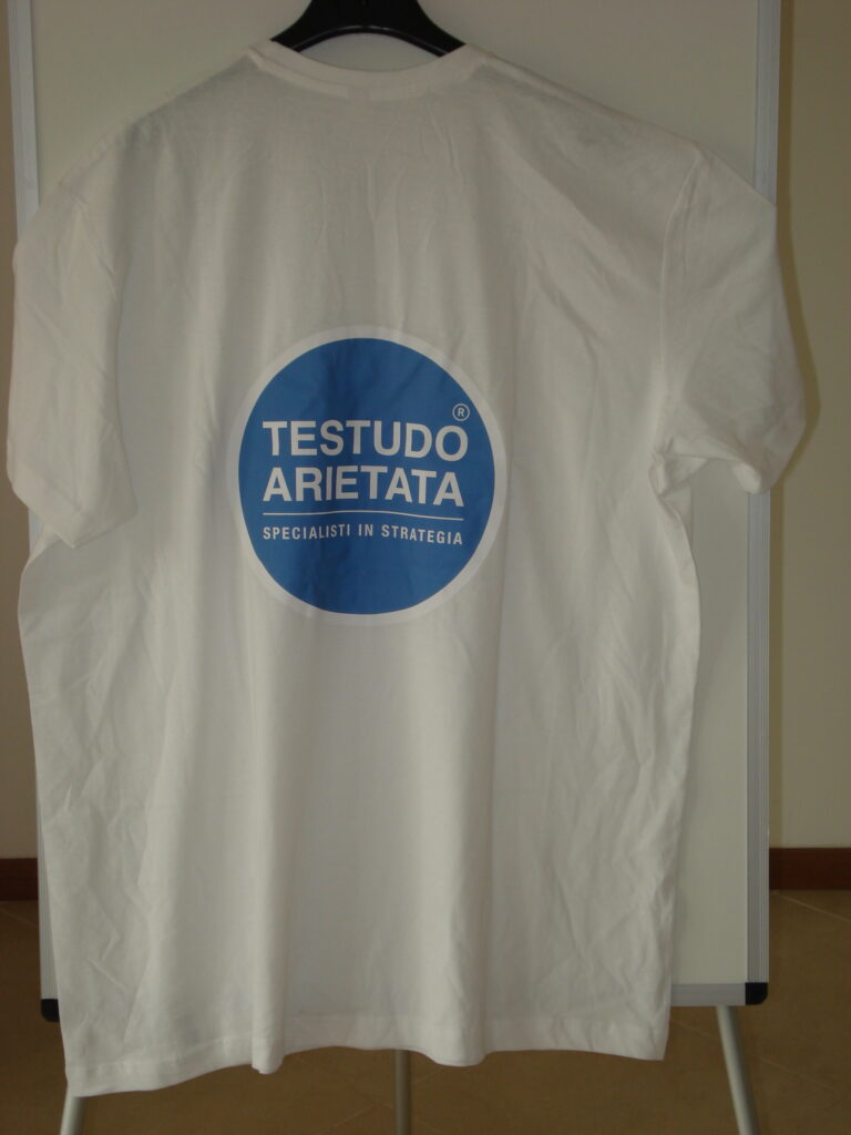Testudo Arietata – maglietta bianca con logo sulla parte posteriore